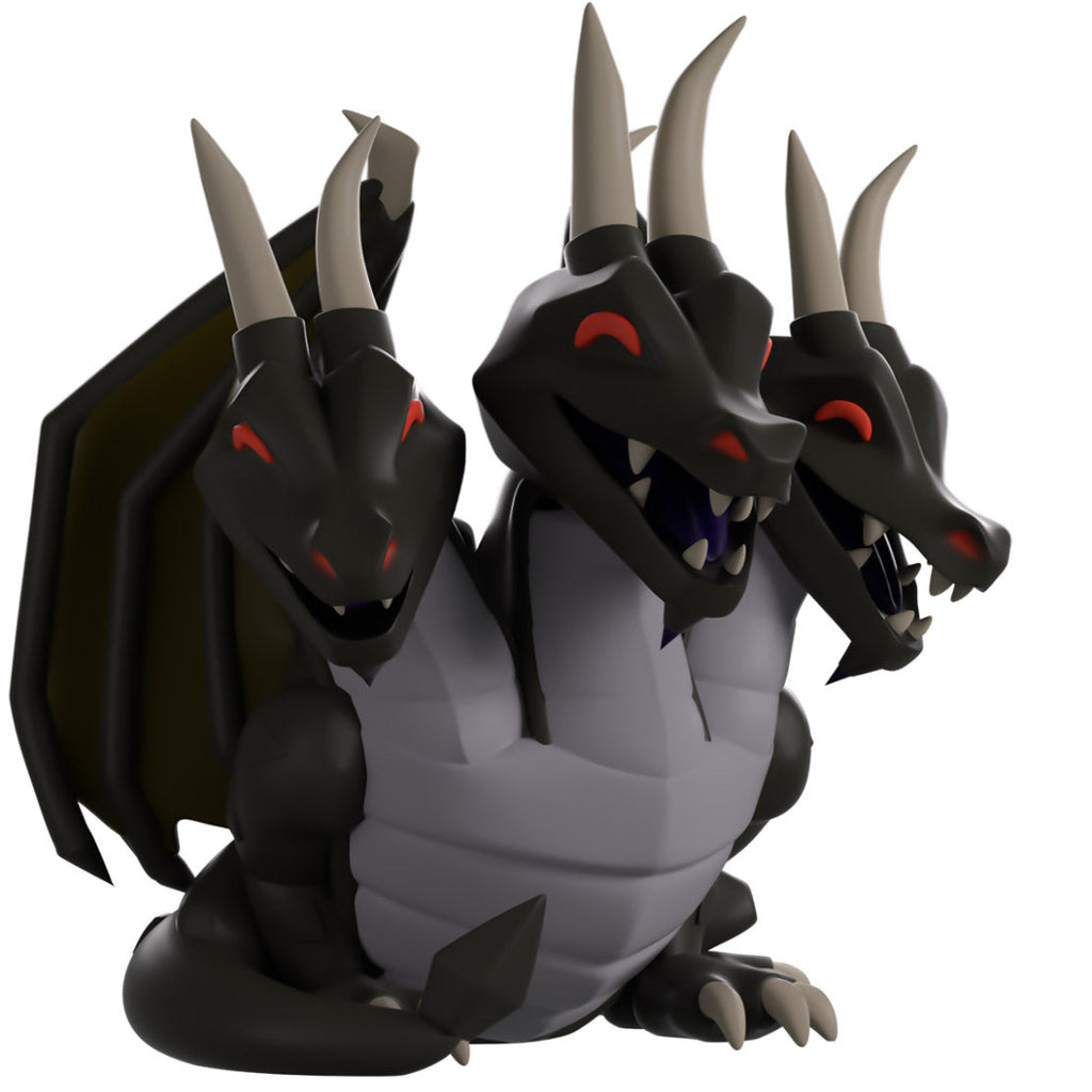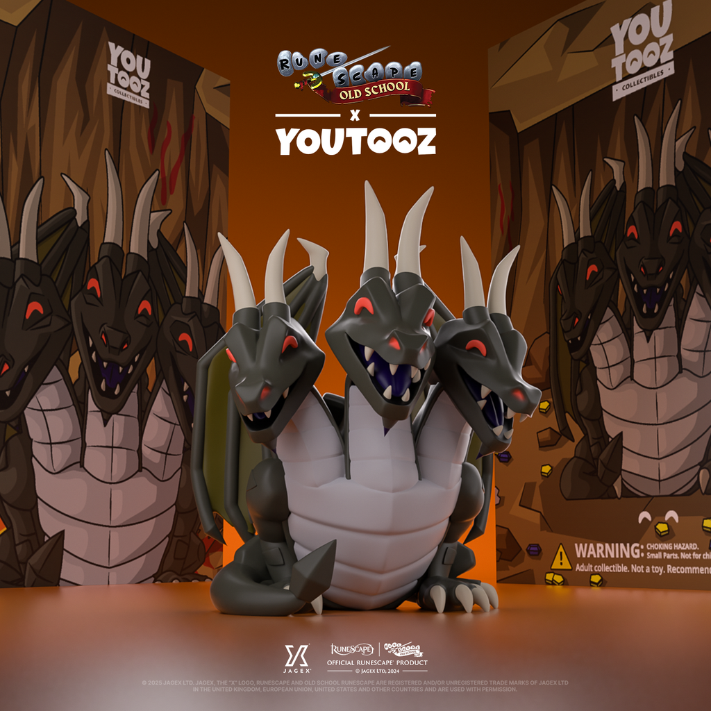 The King Black Dragon may be bored after thousands of years of battles, but we’ve managed to pique his interest with a Youtooz debut! At 4.1 inches tall, with 3 angular heads resting at the top of long necks, bright red eyes shine out from above toothy open mouths as sharp horns stick out from their tops. With a light grey underside and dark green scales, a pair of jagged wings curl out from their shoulders as a long, thick tail wraps around their back and over clawed feet.